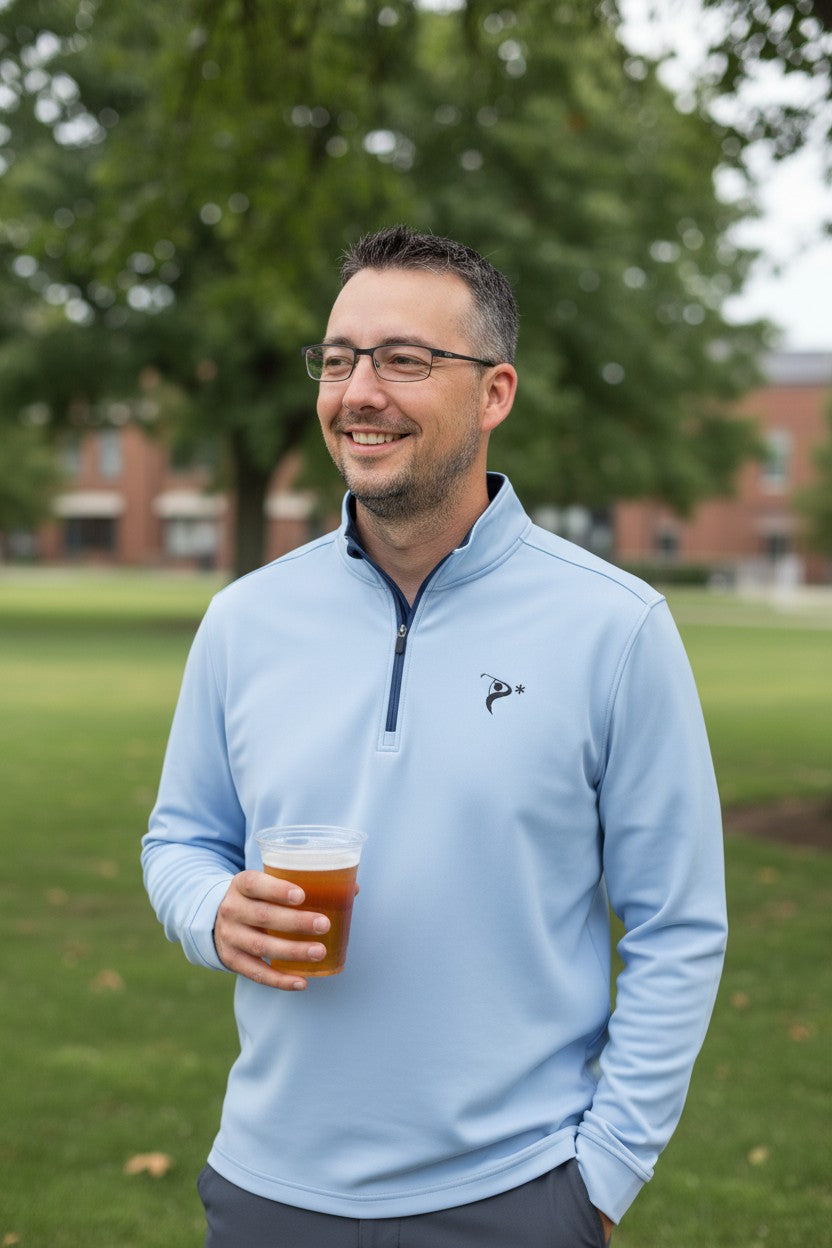 The soft misty blue colorway adds a modern, versatile look that works just as well on the course as it does off it. Finished with a clean Par Adjacent chest logo, this pullover is built for early tee times, cool rounds, and everyday wear.